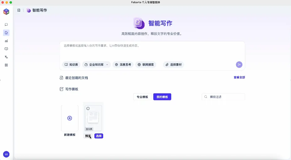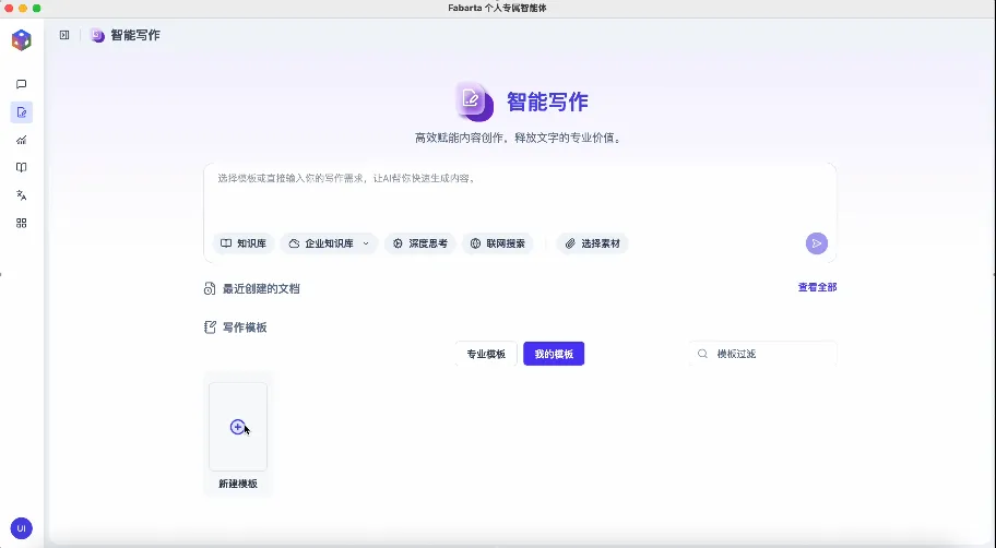 在智能写作模块下,除了智能体自带的专业模板,用户可点击“我的模板”,自定义新模板。