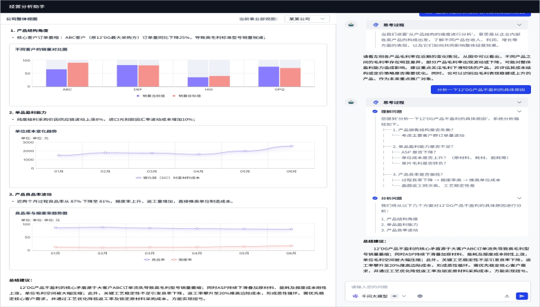 构建基于大模型的的智能体解决方案,围绕“盘现状、锁差距、寻根因”,实现经营分析的自动化、可视化和深度化,赋能数据驱动的战略决策。